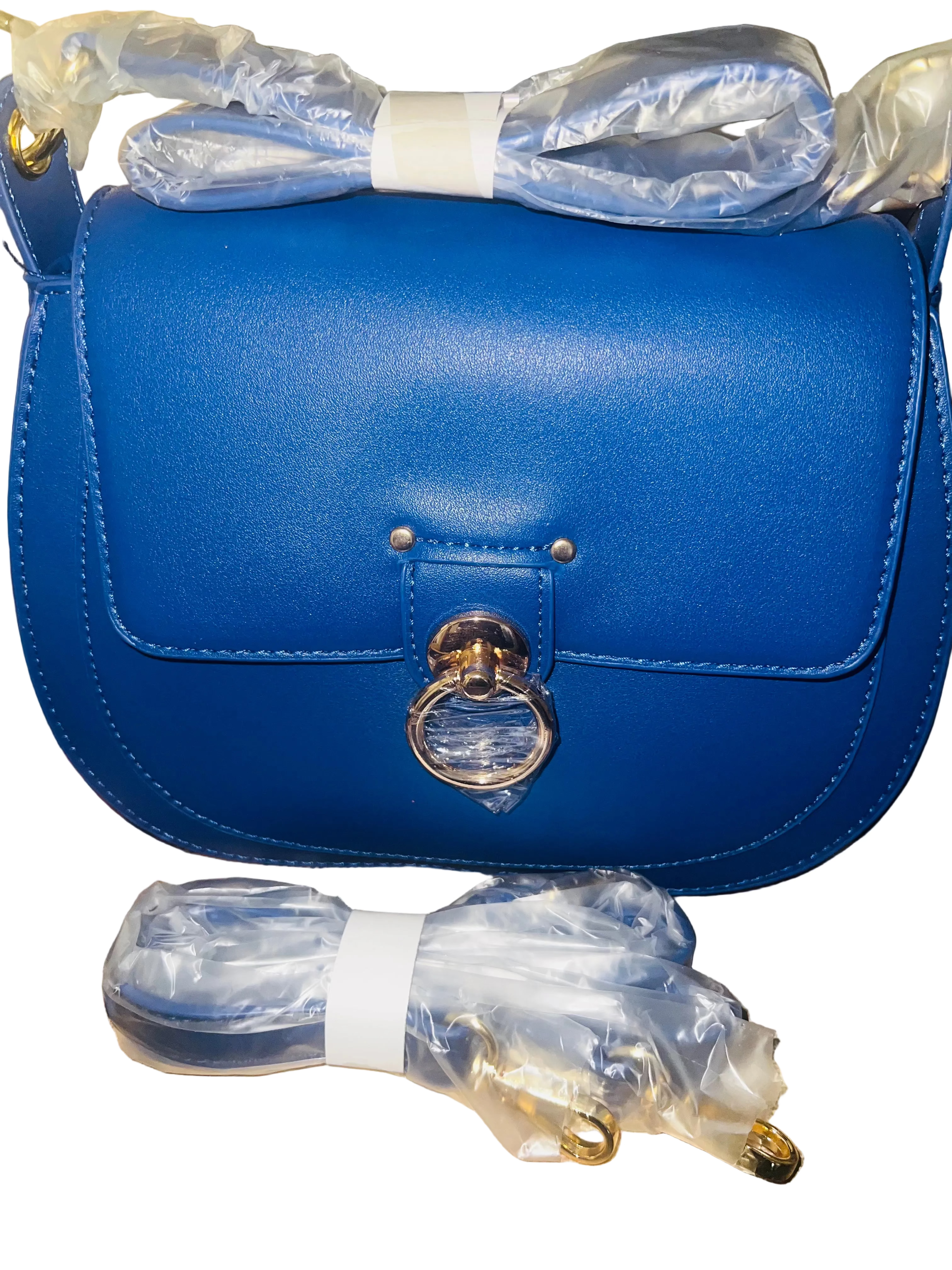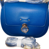 Compact yet spacious enough for your essentials, this crossbody bag features a gold strap and blue hardware for a bold, fashion-forward finish. Perfect for the woman who appreciates designer quality and unique style. New with tags.