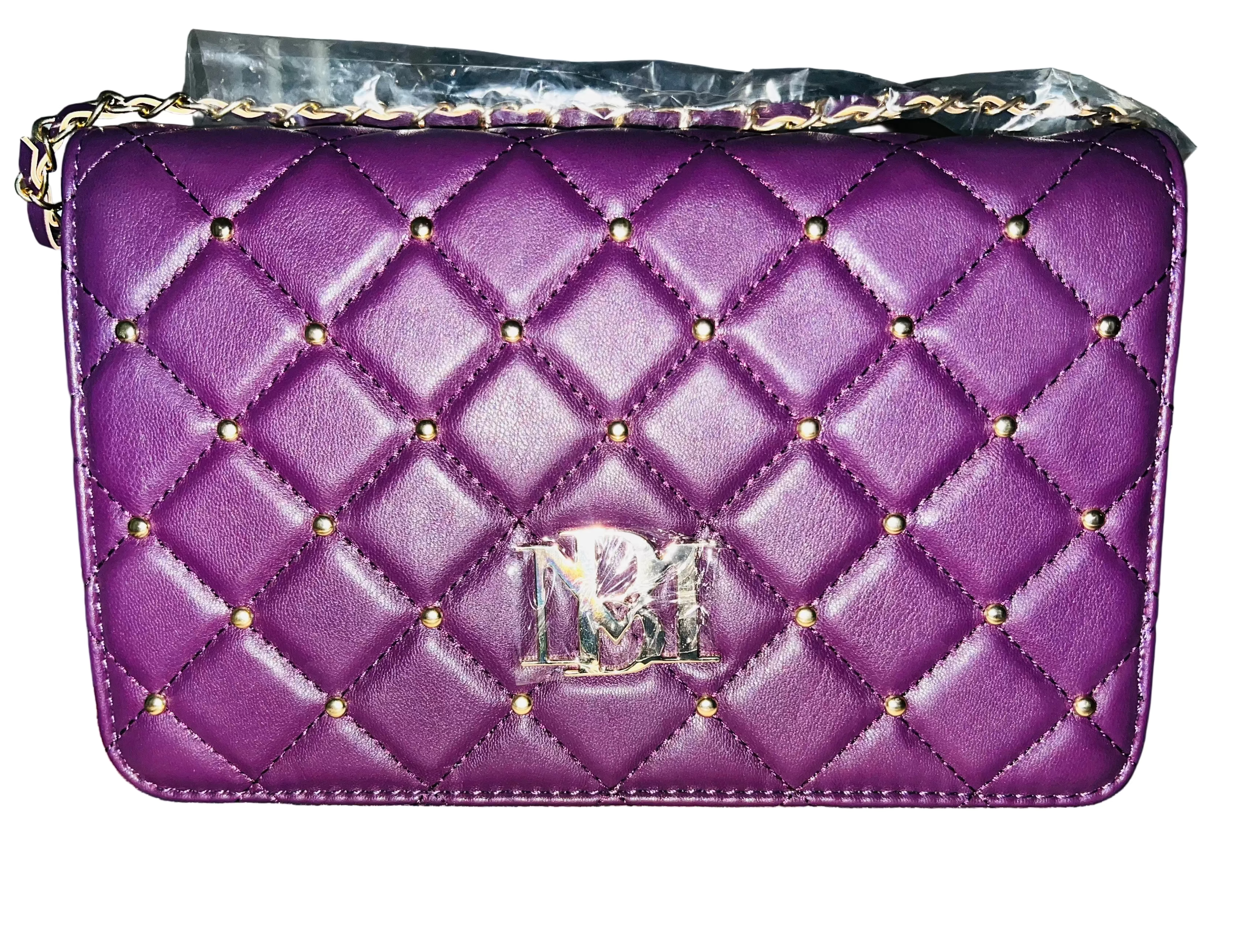 Make a bold, luxurious statement with the Badgley Mischka Plum Quilted Studded Leather Crossbody Bag. This large, round-shaped designer bag features a rich plum leather exterior with an eye-catching argyle/diamond quilted pattern and chic stud accents that set it apart from the ordinary.
