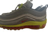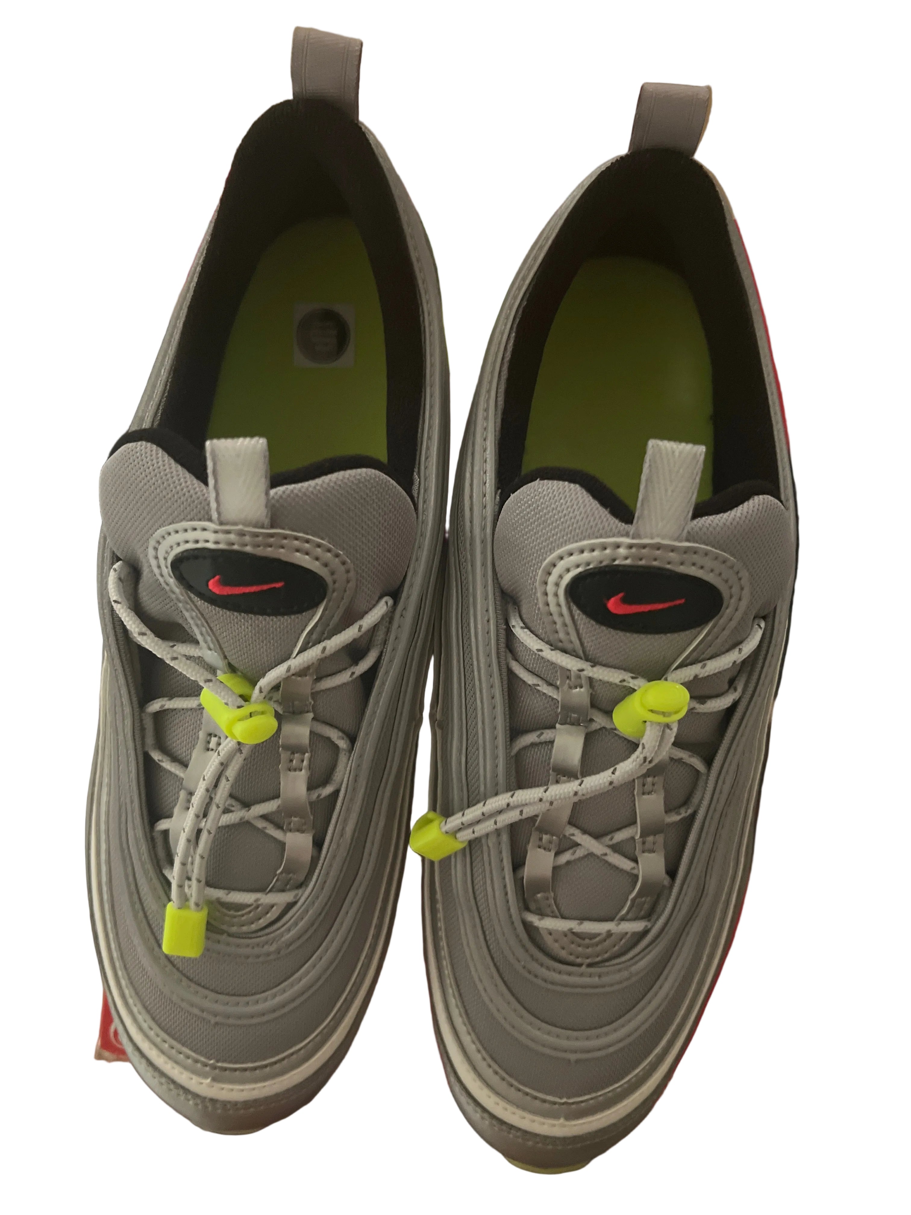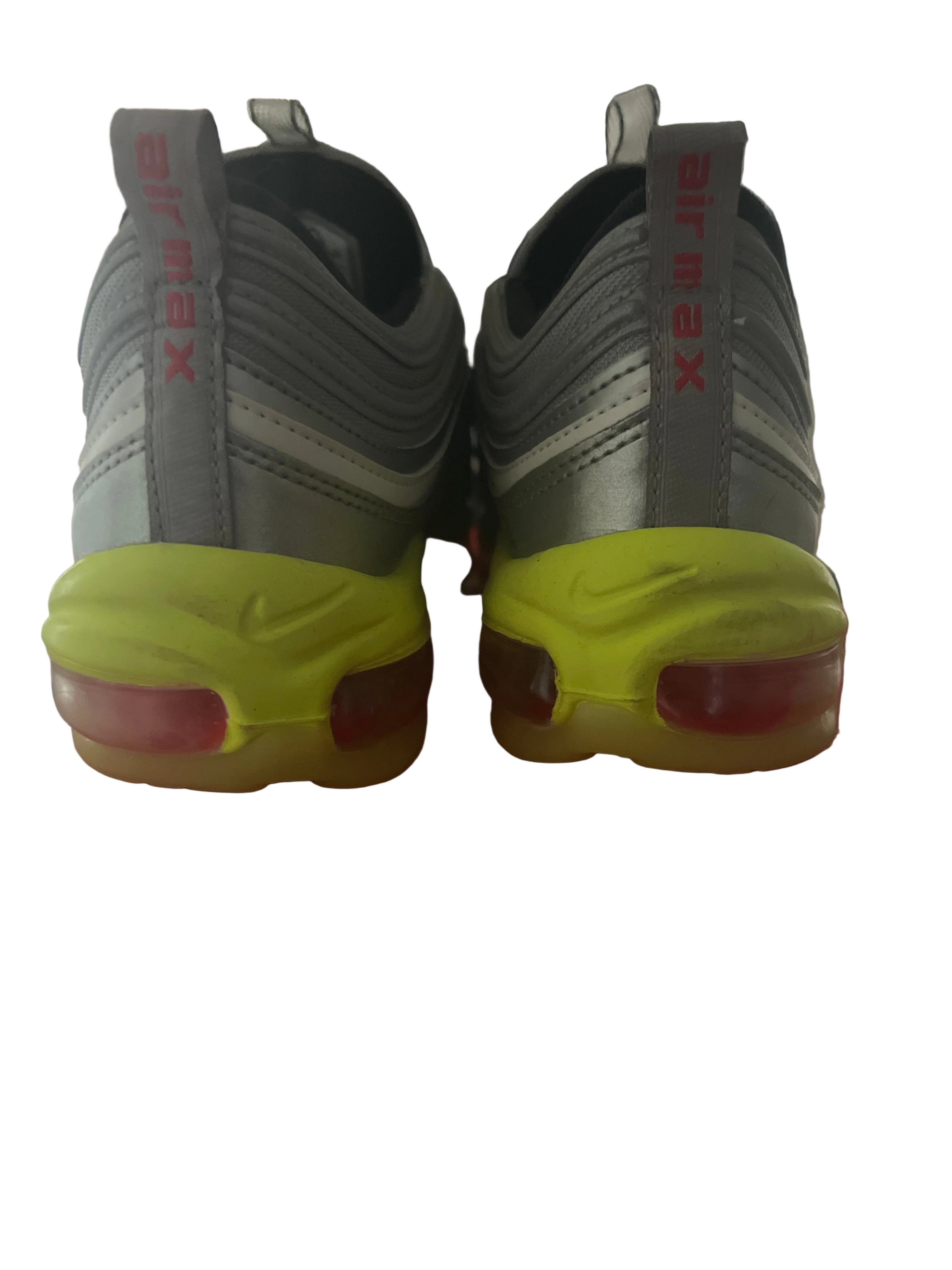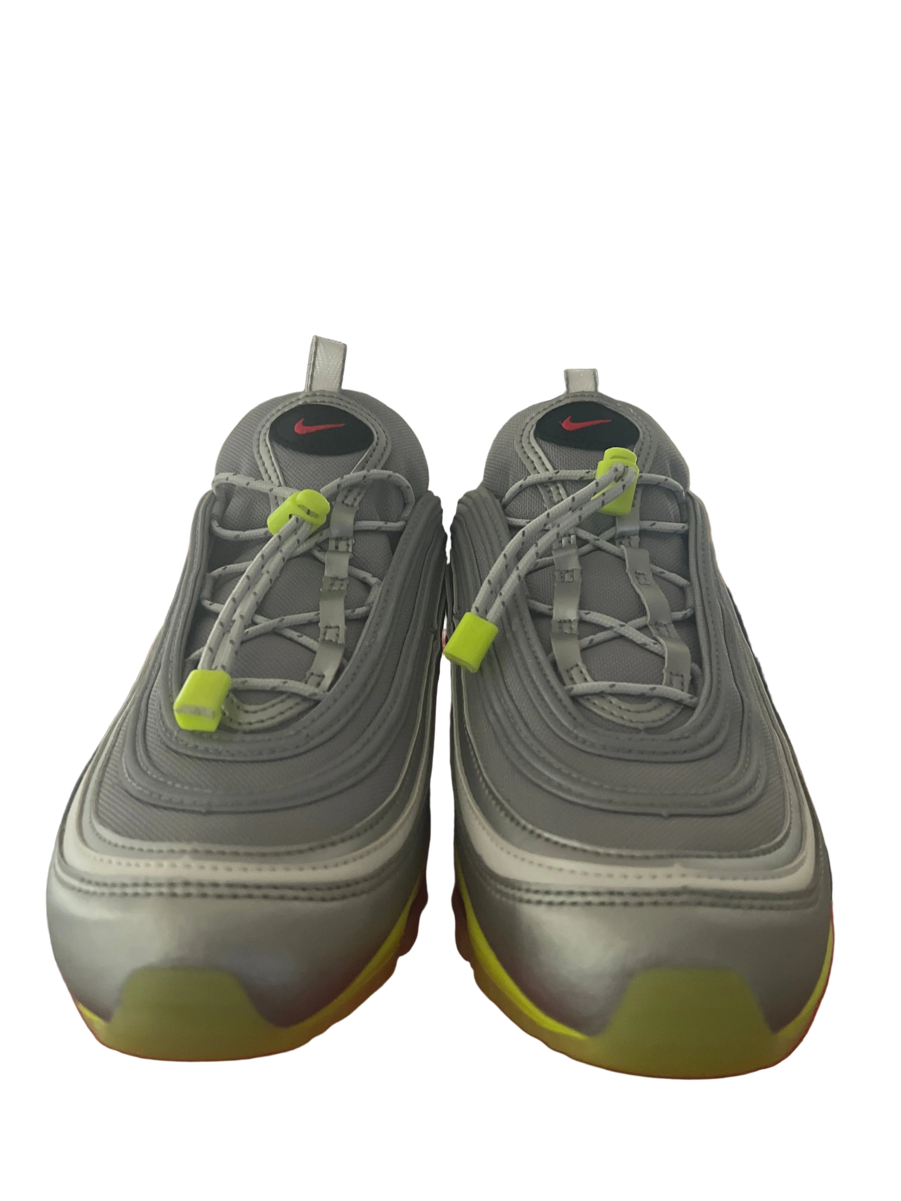 Nike Air Max 97s in the Silver and Volt colorway. They got that classic wavy design but with a bright neon midsole and red air unit that really pops.