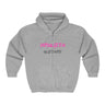 A cozy full-zip hoodie that blends streetwise attitude with everyday comfort. The bold, graffiti-style script across the chest pops in bright pink with a subtler shadowed line beneath, giving a layered, urban-art look. Tubular knit construction keeps the silhouette clean and waste minimal. The roomy front pockets and adjustable hood make it easy to layer on chill evenings or wear while cruising the city. It feels lived-in from the first wear—soft, warm, and ready to travel with you to late-night meetups, studio sessions, or casual weekend hangs.